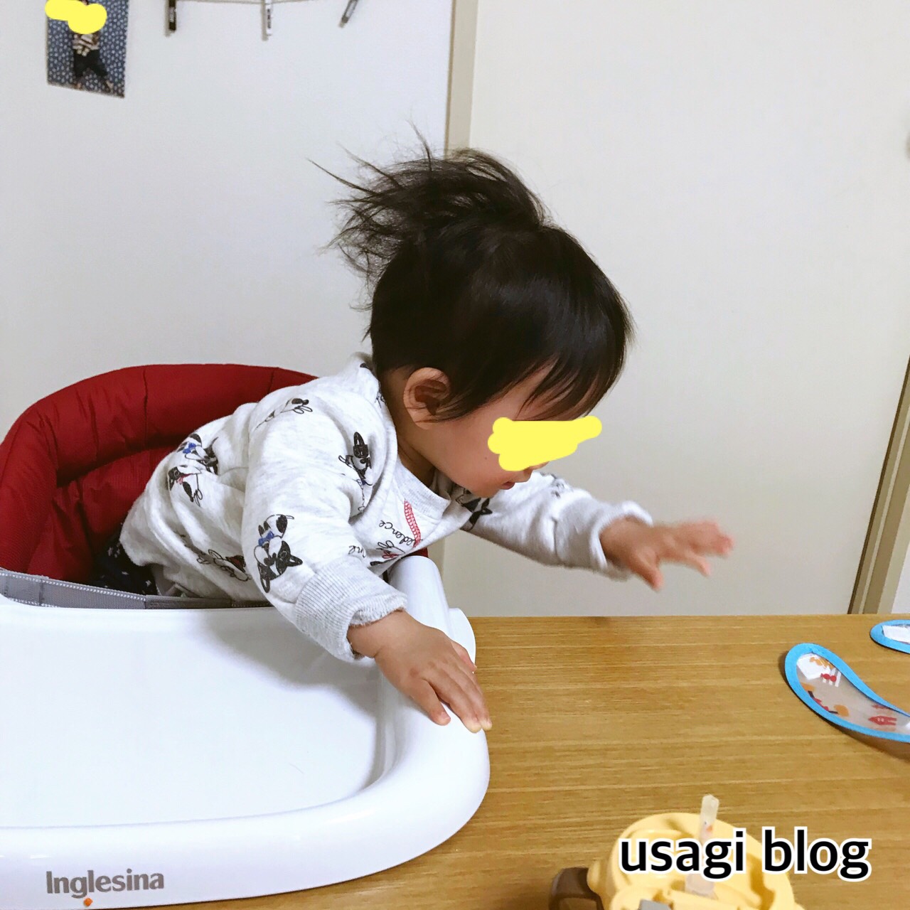 ・ベビーチェアから身を乗り出すように