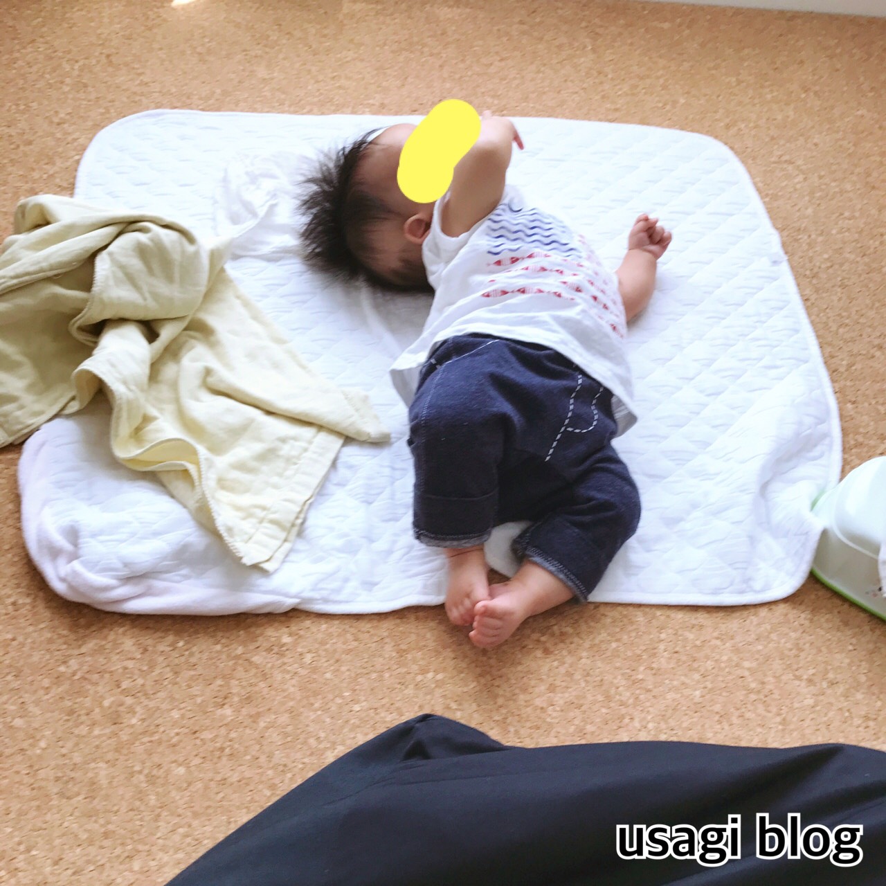 昼間はお腹にタオルやモスリンおくるみをかけていますが、大体蹴飛ばされてます(;´∀`)