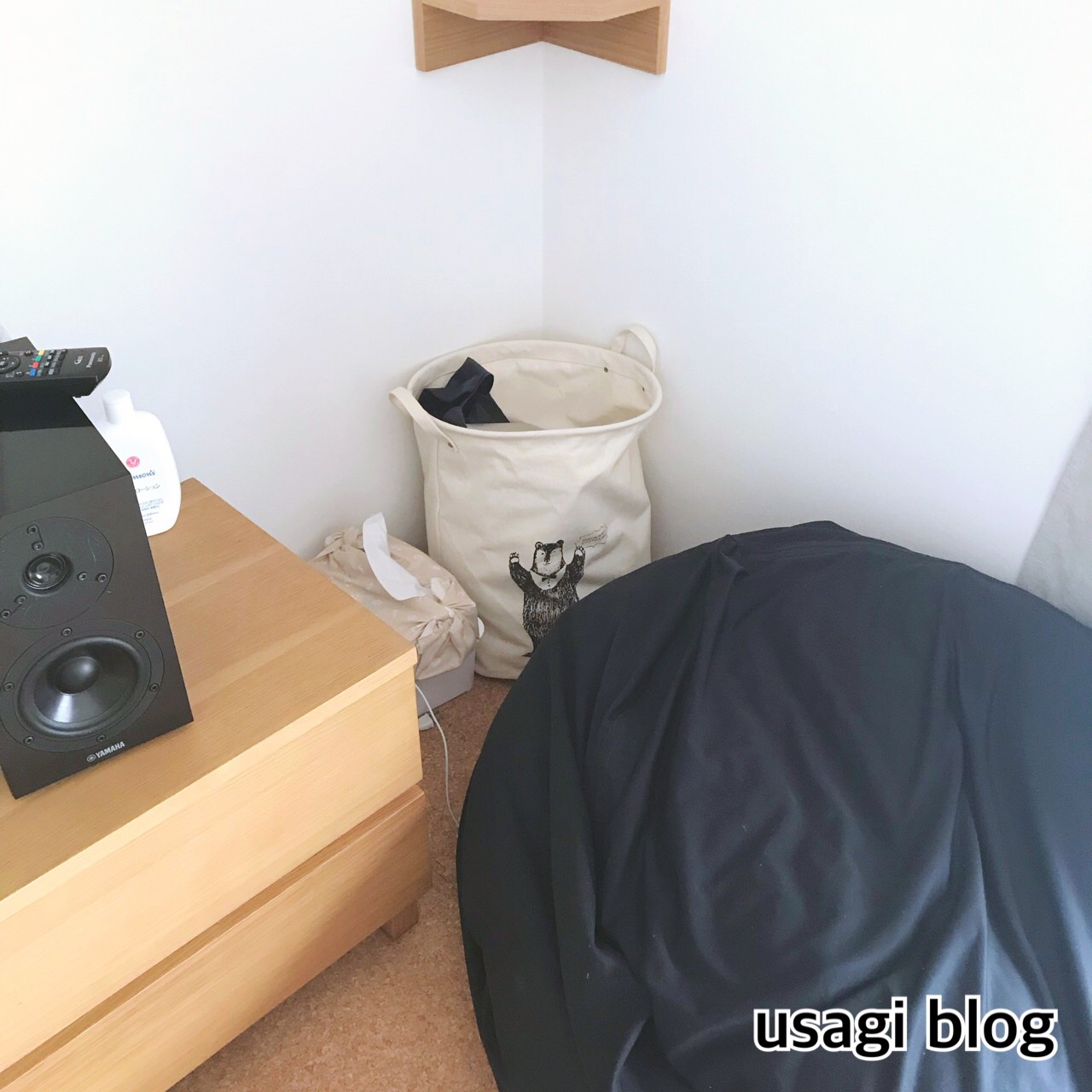 一番奥のクマの絵のカゴは、旦那が結婚前から使っていたランドリーバスケットです。