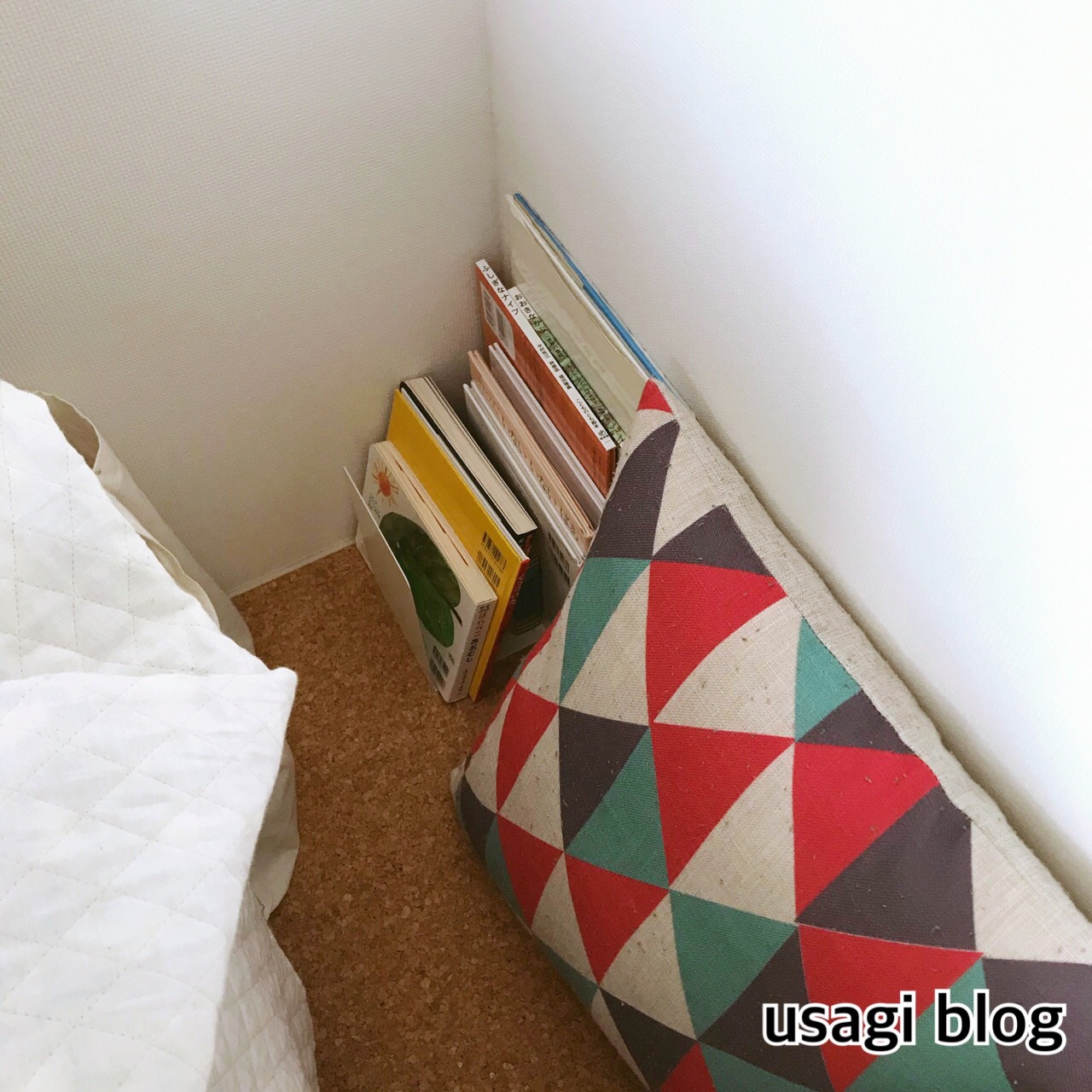 ただ、最近ここに絵本を隠していることに気づかれてしまい、クッションを乗り越え、キルト生地をはぎとり絵本を発掘してくるようになりました…
