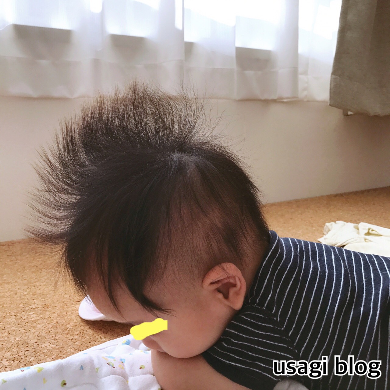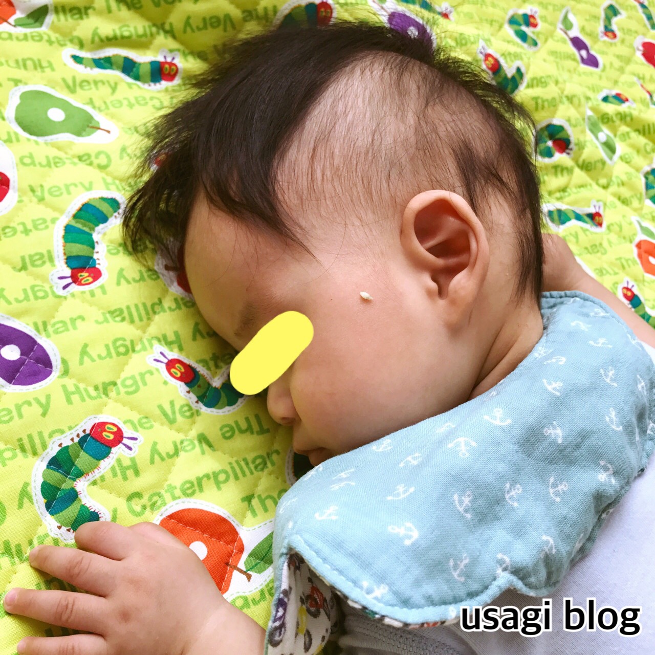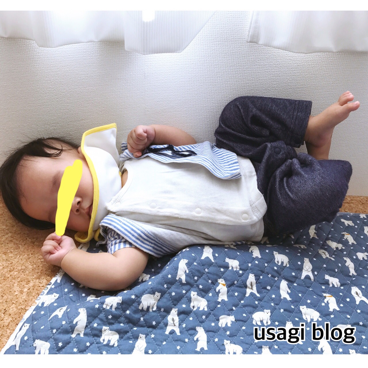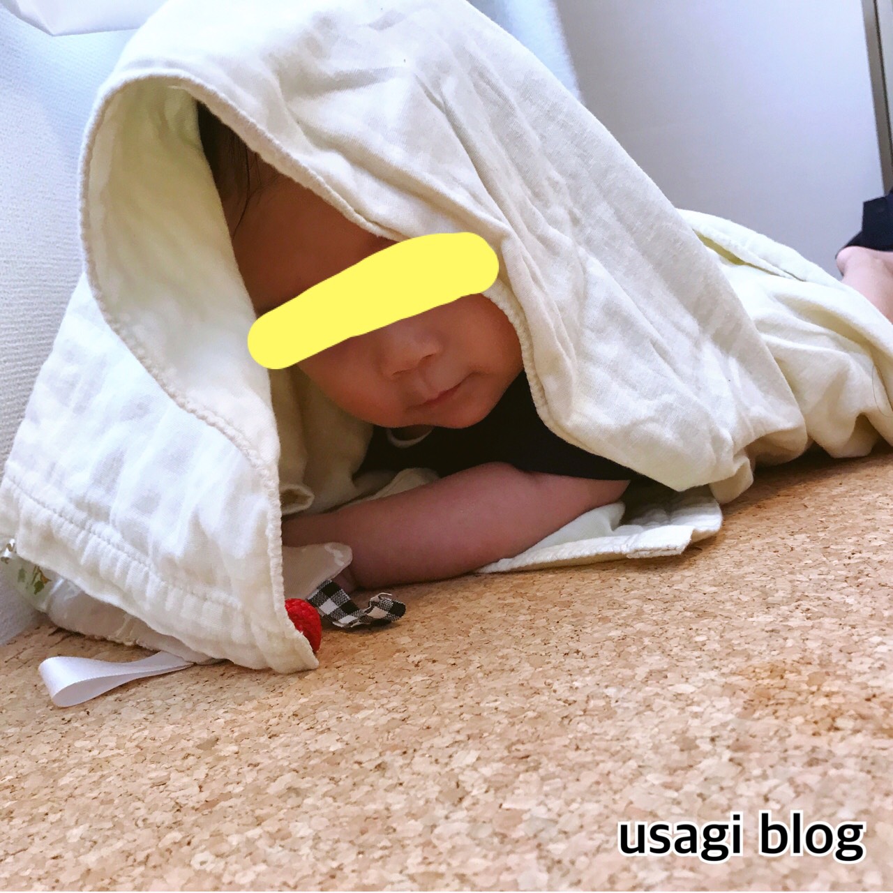 現在はキルト生地を敷いていますが、おくるみやガーゼタオルを敷いていたときは寝返りのせいでよくこんな感じになっていました。