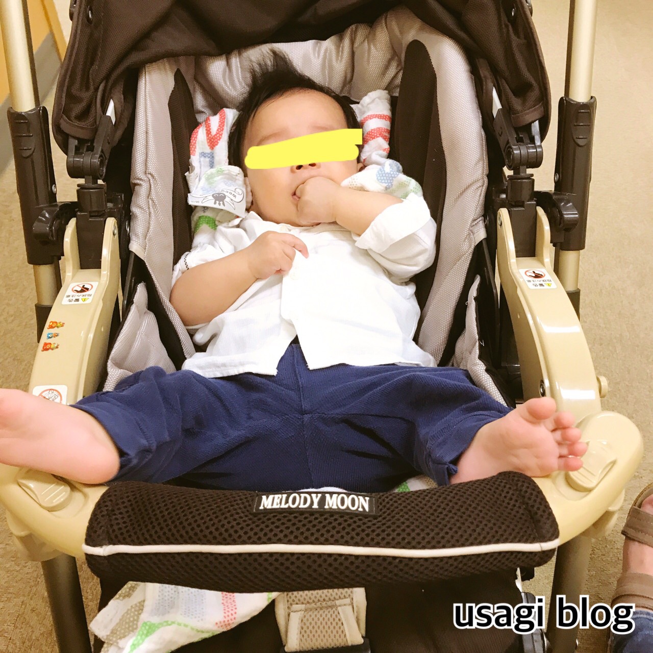 ベビーカー内でだんだん動くようになってきて、足はつねにここにあります。