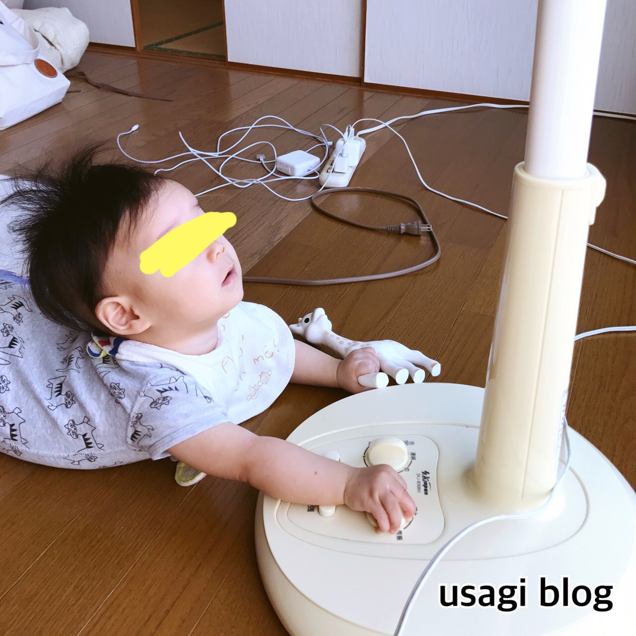 この日は扇風機はついておらず、また、この付近はコードもいっぱいあるので離れたところに寝かせていました。